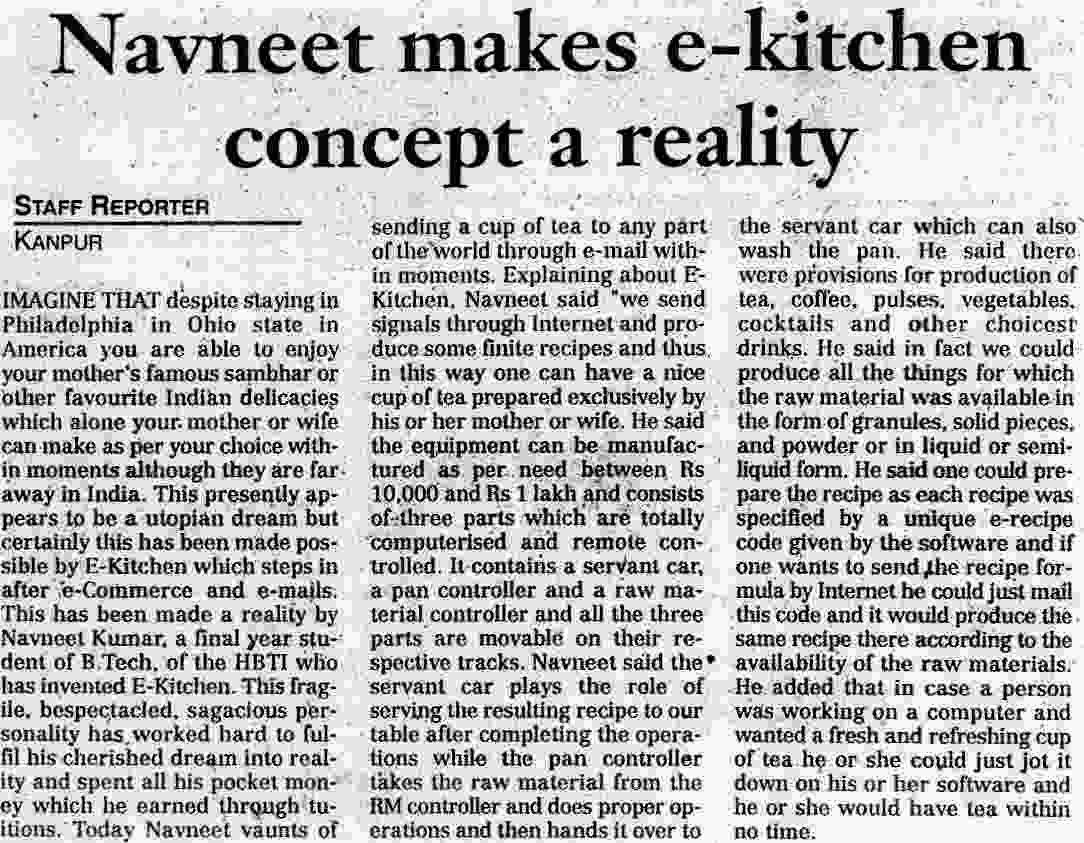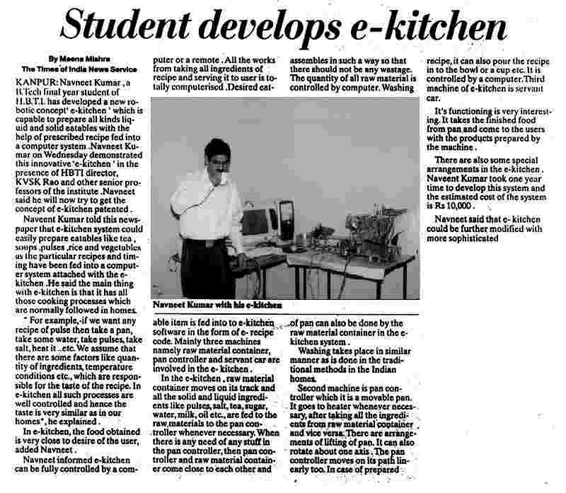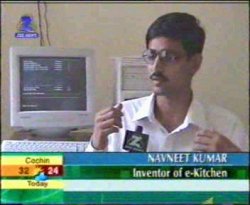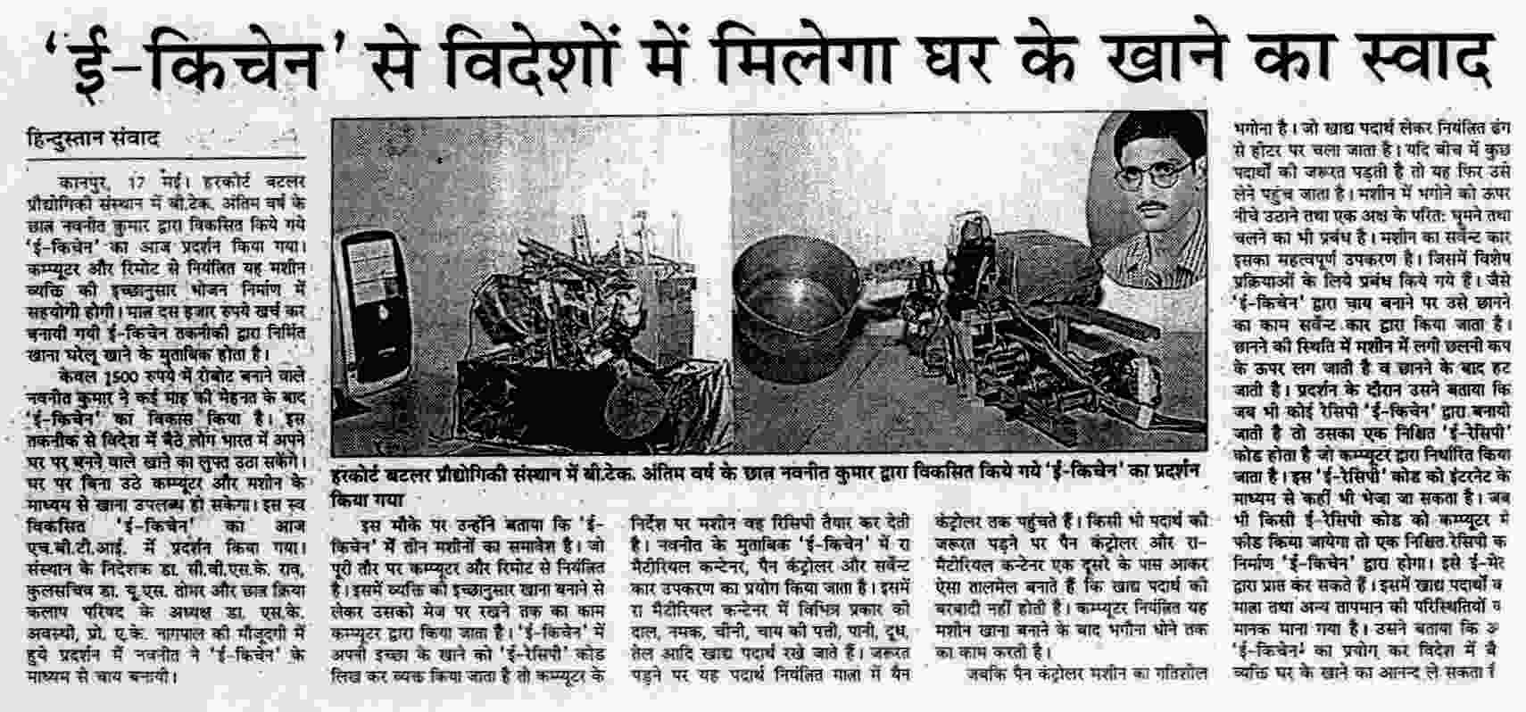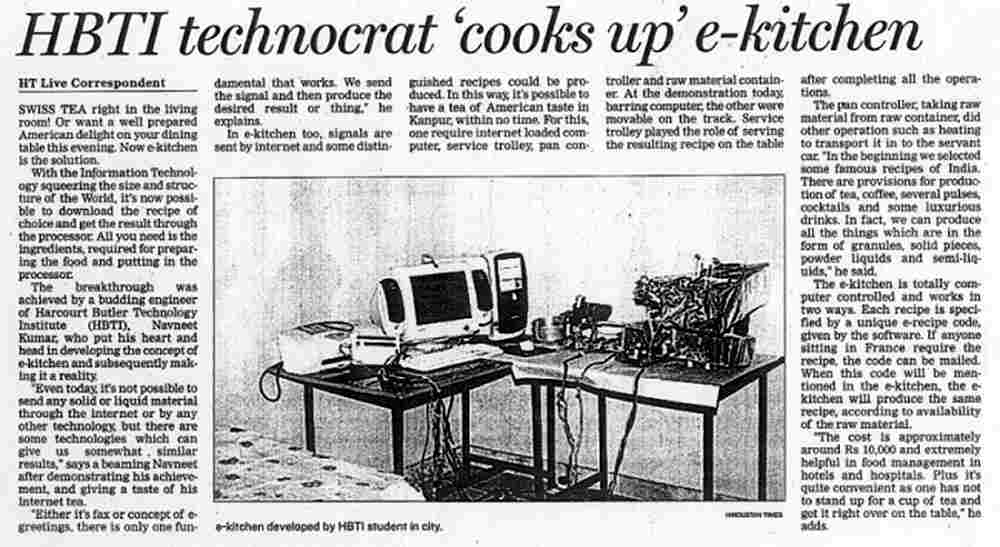 There is a group of machine working as automated kitchen. Everything is automatic like lifting the pan, pouring the liquid like water or milk, putting the granuals like sugar, prepare the recipe by heat and even washing utensils. It can not be used for chapaties. Every recipe has a unique code and using internet this code can reproduce the same recipe around the globe on the similar other e-kitchen. Thats is reason it is named as e-kitchen.